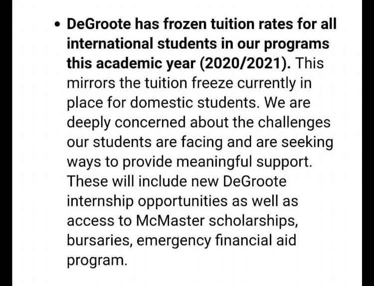 上面写着,麦克马斯特大学DeGroote商学院将于2020/2021学年冻结留学生学费,确保学费不会上涨。同时,校方还指出,他们深知留学生们面临的巨大困难和挑战,因此愿意为他们提供支持。