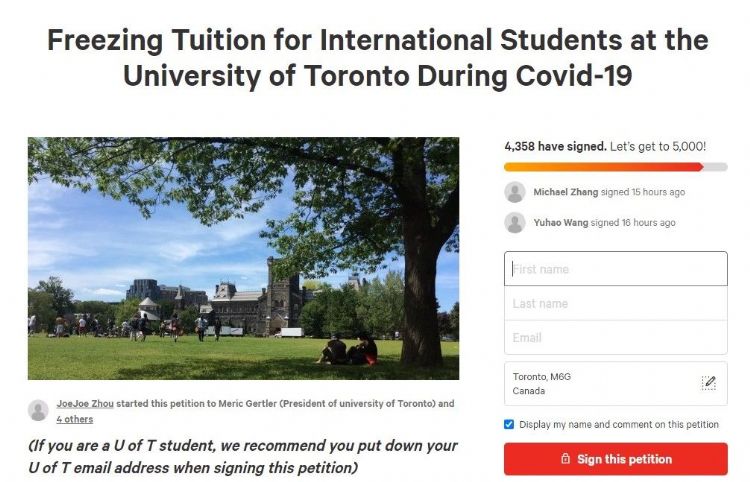 该请愿计划收集5000个签名,截至目前已经有4358人对这项请愿表示支持。请愿书说,目前,各国的货币以惊人的速度贬值,很多国际学生的家庭正面临失业和倒闭的困扰,因此无法有足够的现金流来支持海外的学生;而那些依靠兼职工作来支付高昂学费的留学生,现在也无法自给自足了......